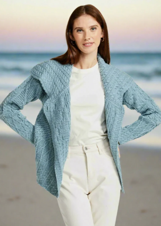 Combining a rich variation of the cable, diamond and chevron stitches (popular Irish sweater patterns), it is complimented by an over-sized ribbed wool collar. This design is truly unique and is the perfect cardigan for every season.