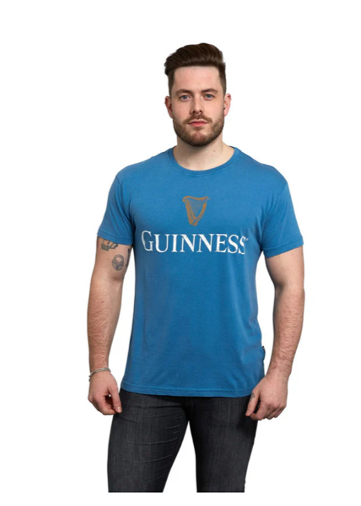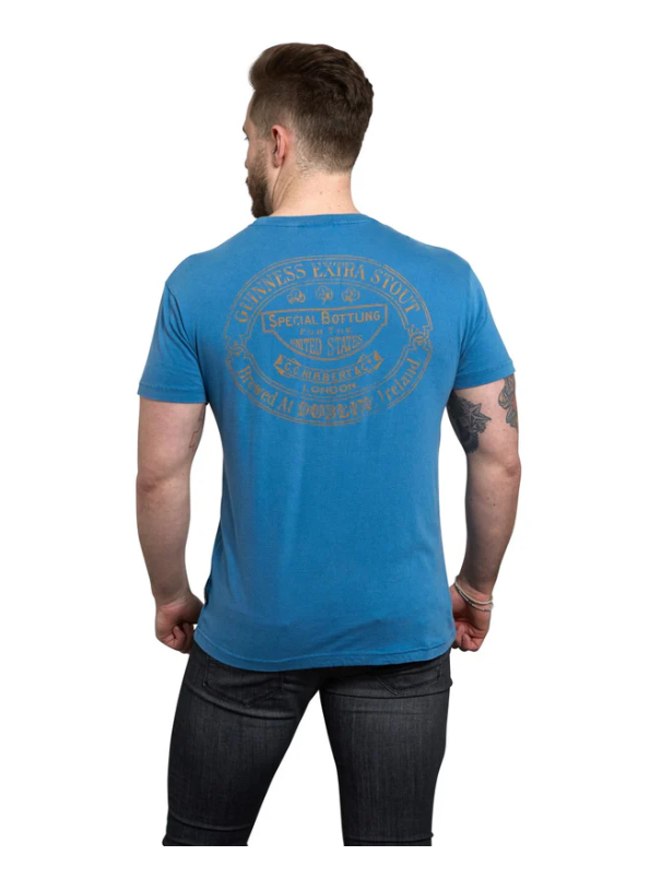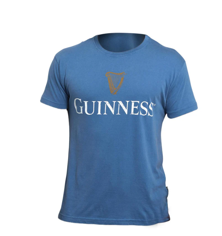 The 'Guinness® Trademark Label T-Shirt Blue' is a durable and comfortable unisex tee with a vintage style print.