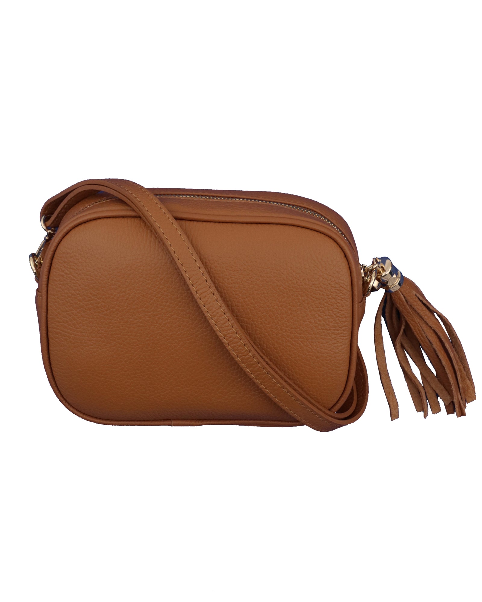 This bag has gold-coloured metal zips and clips, and a leather tassle on the zip. Inside there is one compartment in camera bag style and one side internal pocket.