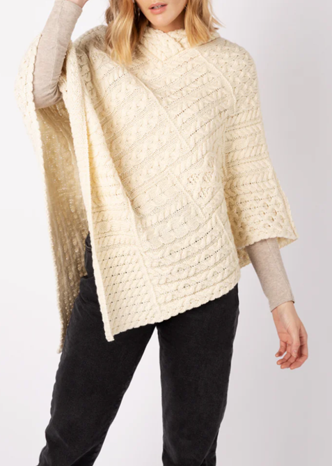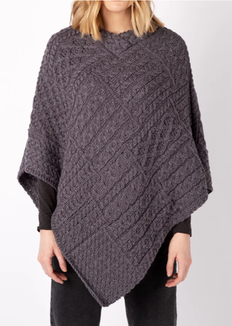 As part of the Aran Classics Range, this 100% merino wool poncho uses a patchwork style of different Aran cables and stitches, making it rich in both heritage and texture. Finished with a delicate cable collar. A two tone grey marl made up of light grey and dark grey.