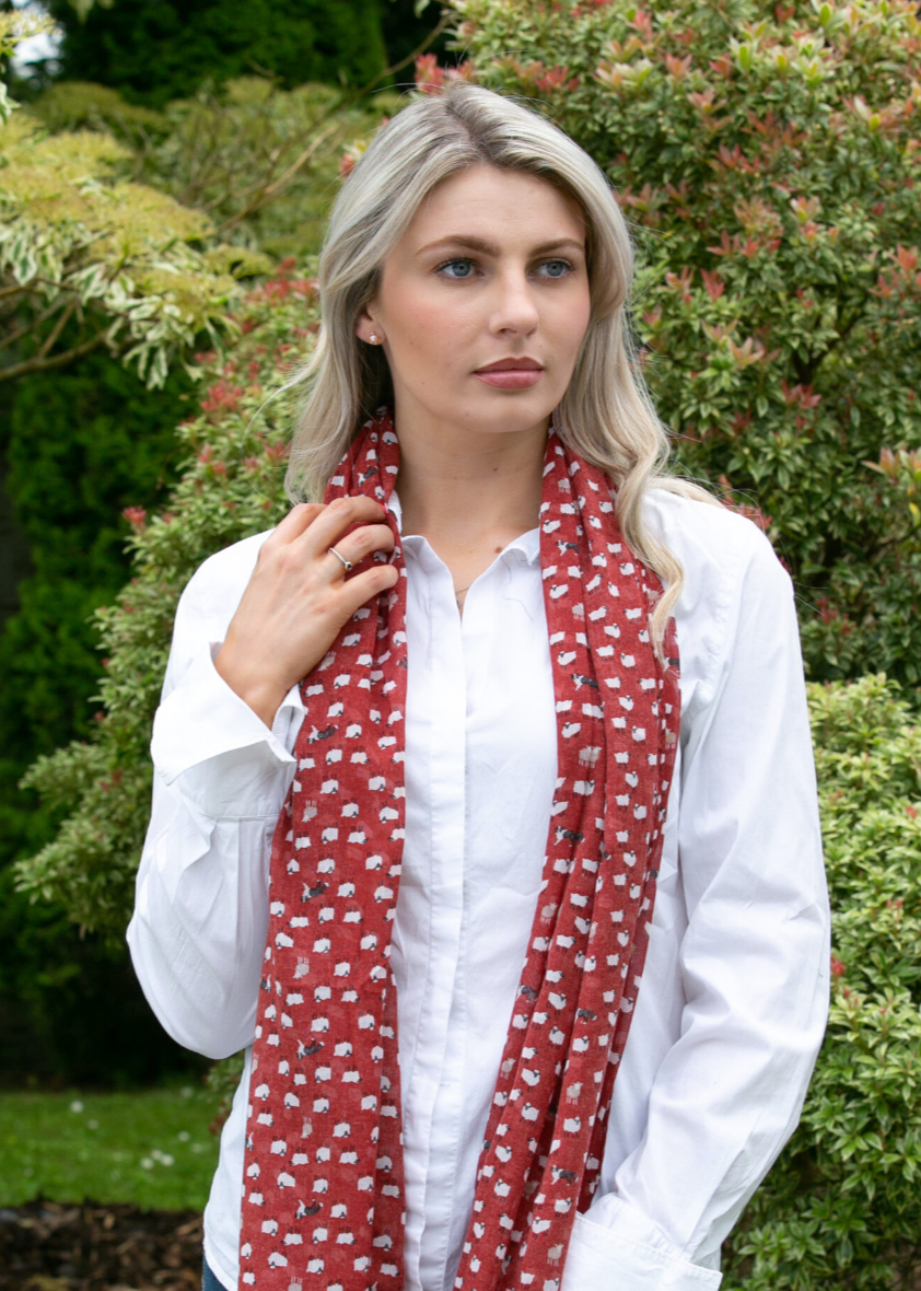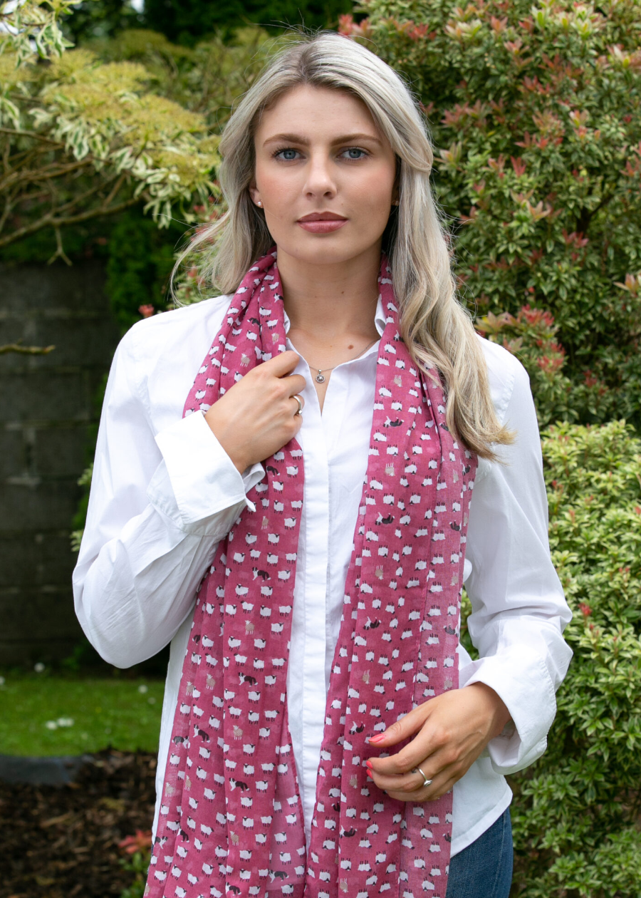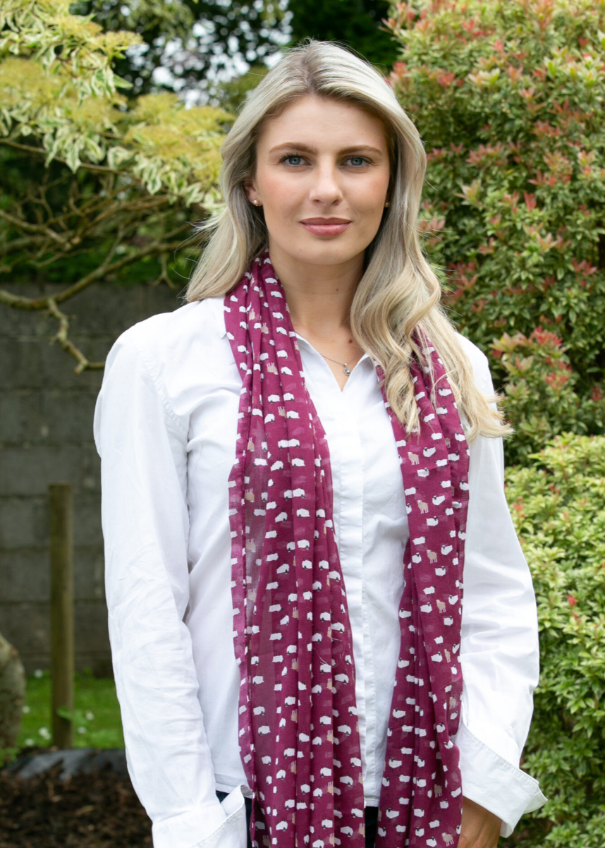 Lightweight polyester plum-coloured scarf in a mini-sheep print.