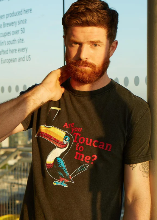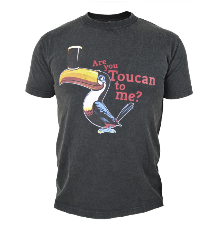 This gray Guinness T-Shirt features a classic Gilroy toucan illustration front and center , with the iconic pun 'Are you Toucan to me?' printed on top of fabric.