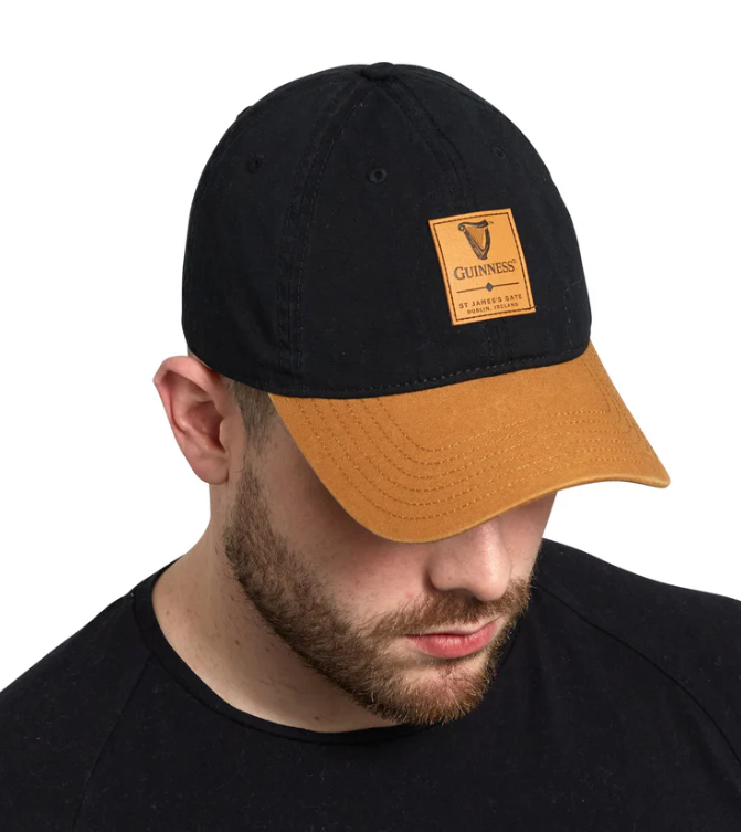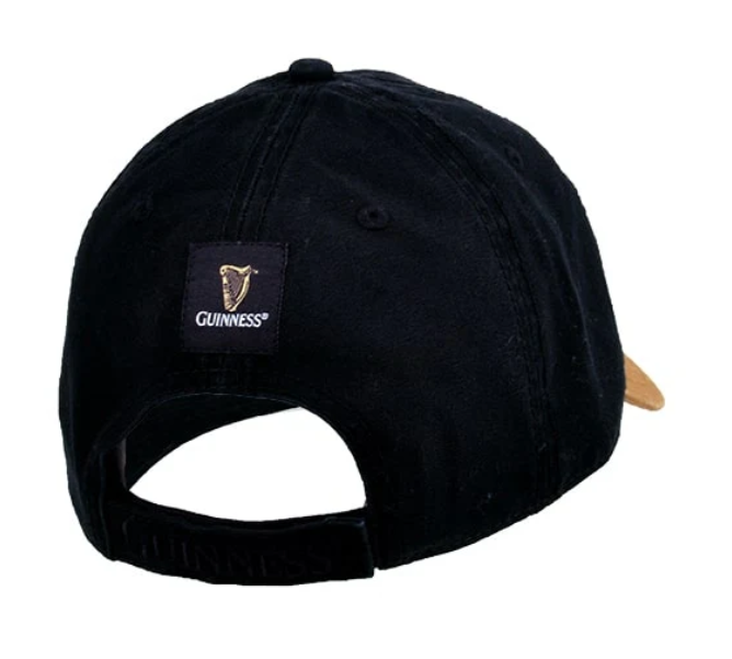 The Guinness® Black and Caramel Cap is a modern twist on the traditional black baseball cap, made with 100% cotton. Adjustable size and featuring an appliqued woven 'Guinness' patch.