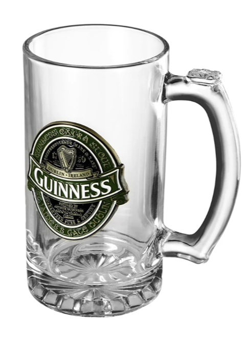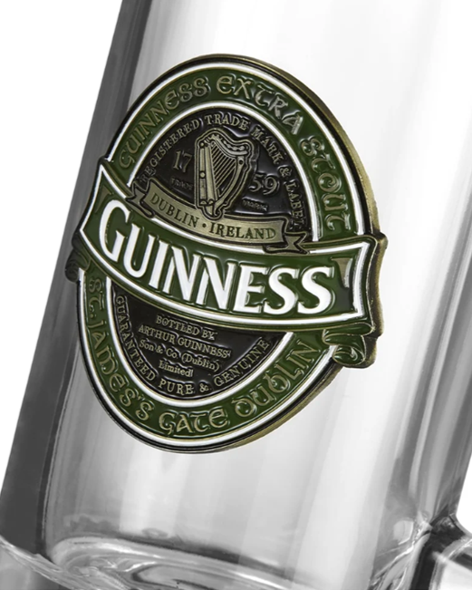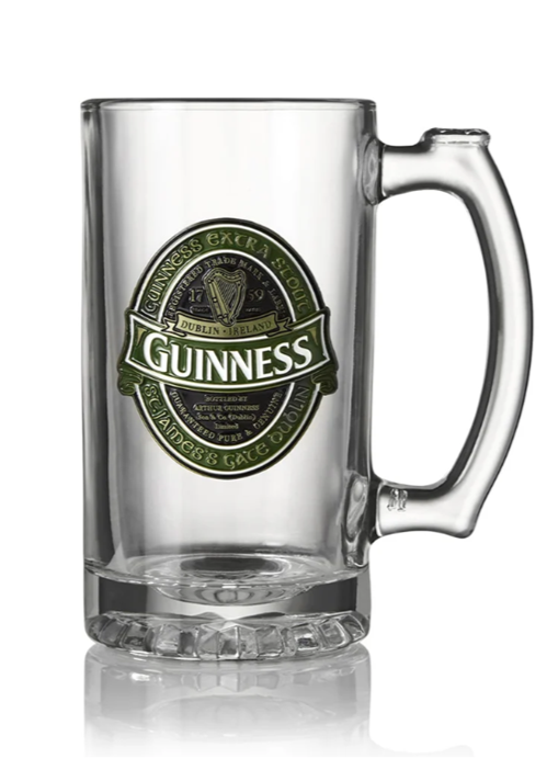 The Guinness Ireland Tankard with Badge. A must-have for Guinness lovers, featuring the classic logo in black with green and gold details.