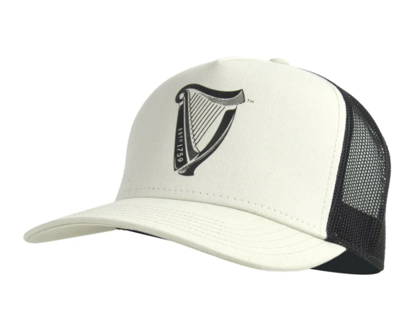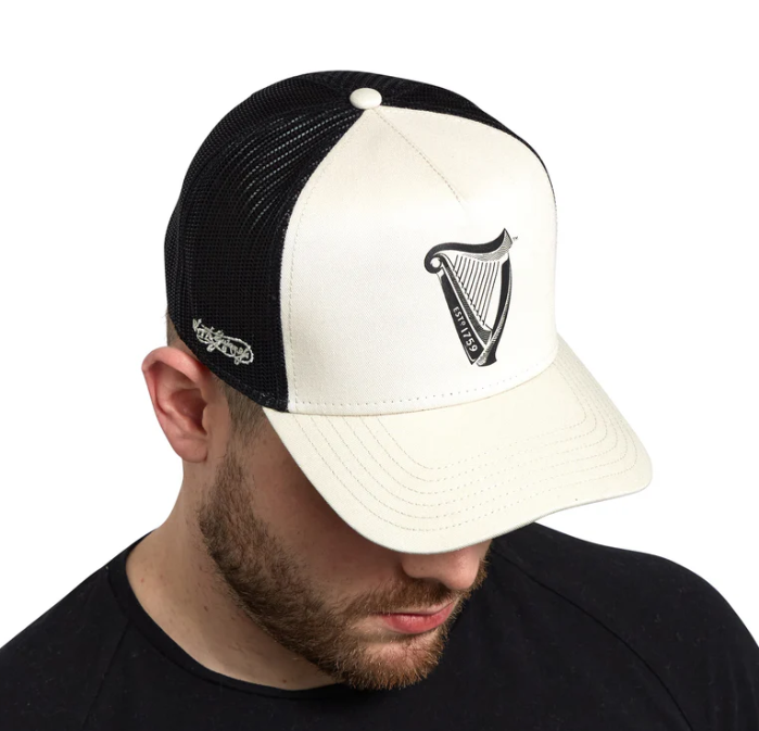 The 'Guinness® Premium Beige & Black with Harp Hat' is a must-have for any fan, featuring a printed 'Guinness® Harp Logo'.