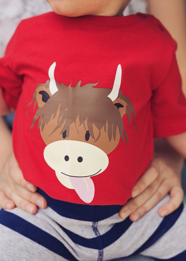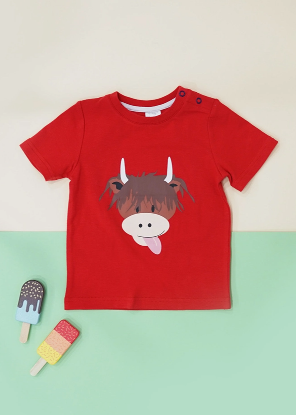Our best selling Highland Cow has been given a summer make over. A bright red t-shirt features the Highland Coo face with its cheeky little tongue poking out. Our summer t-shirts are made from a light-weight jersey cotton and feature shoulder poppers for easy dressing.