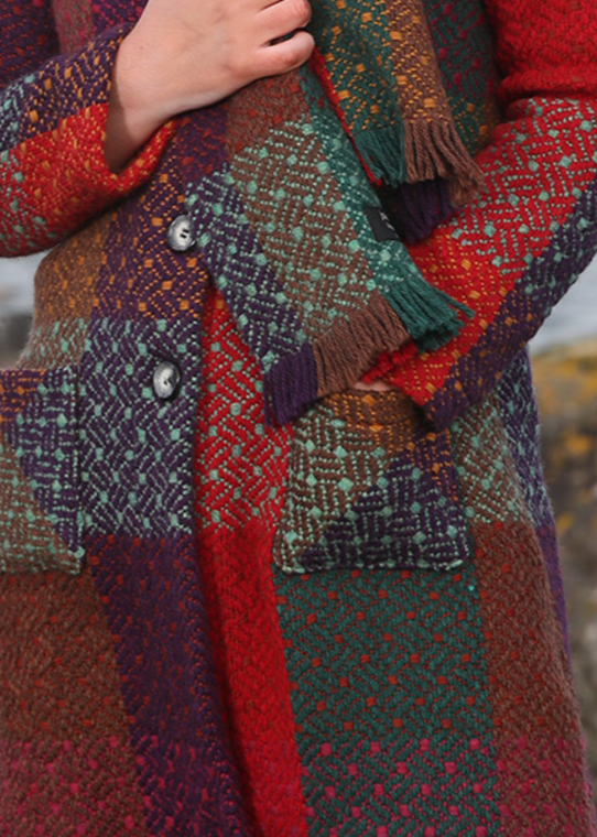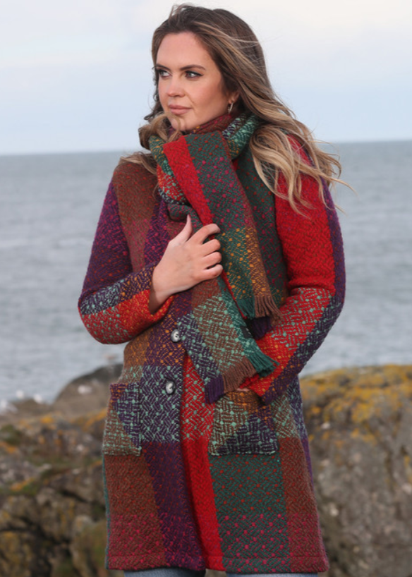 This beautiful and unusual lightweight long coat is woven from a rich wool blend at Branigan's mill in Ireland.