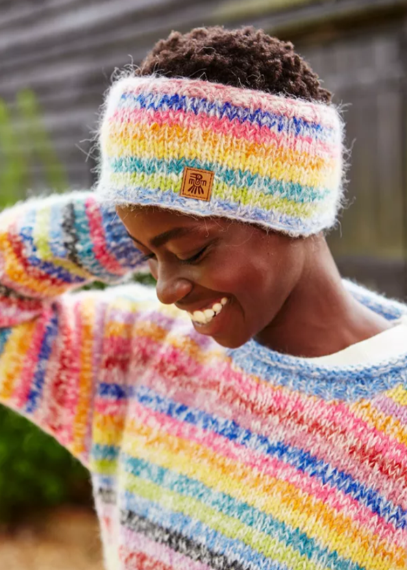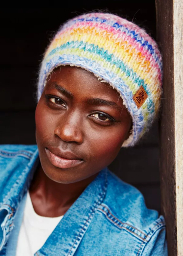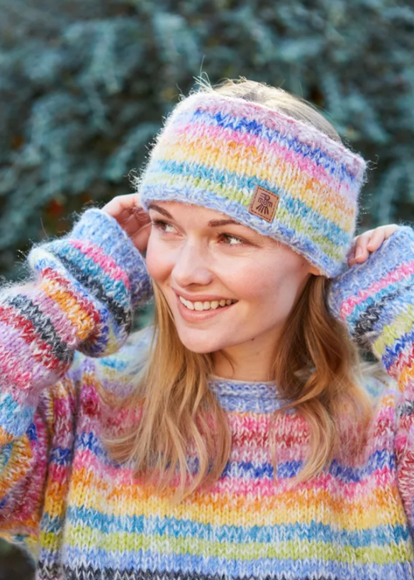 Women's hand knitted mohair wool ear warmers. Bright and cheery rainbow stripe design. Sherpa fleece lined for extra comfort. Fair trade and handmade in Nepal.