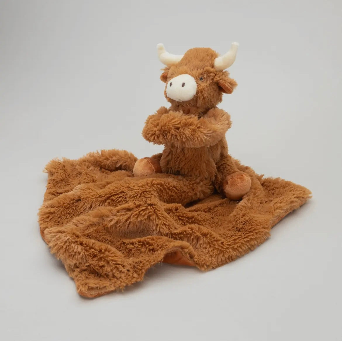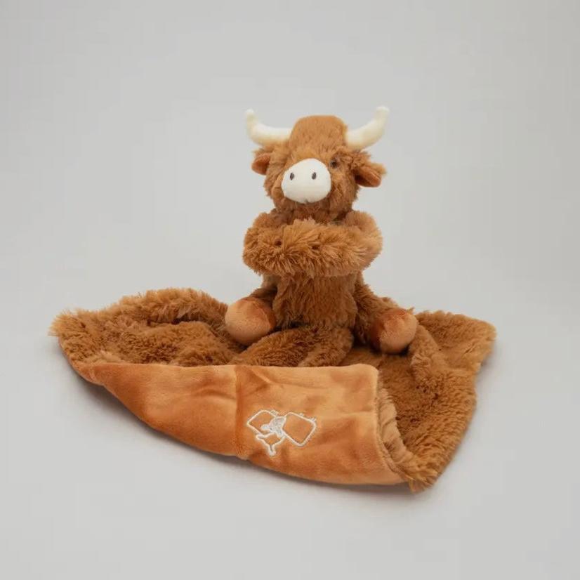 Super soft double layer comfort soother blanket with a mini toy attached.