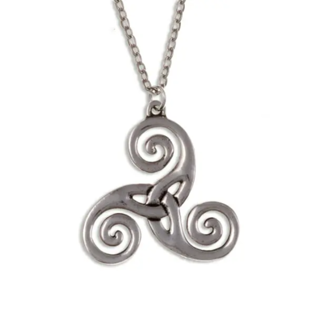 Triscele pendant – pewter triscele pendant with cut out entwined detail, comes on an 18″ rhodium-plated trace chain