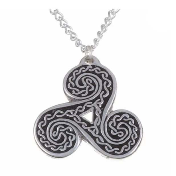 Pewter pendant with embossed Triscele ribbon design on 18″ tin-plated or surgical steel curb chain.