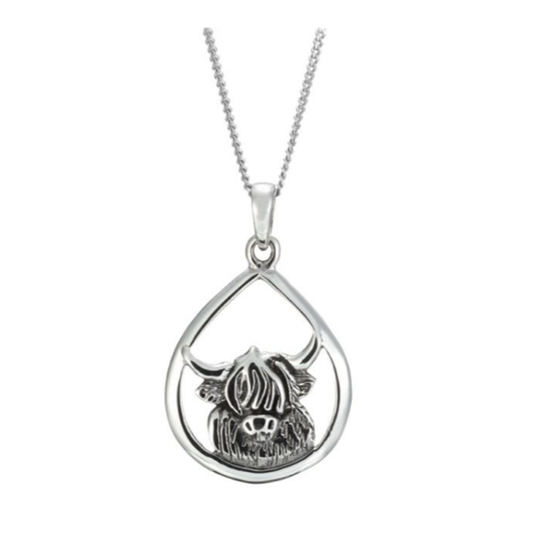 Sterling Silver Highland Cow in teardrop necklace presented in our quality gift box on an 18 inch Sterling silver chain. 17mm by 23mm